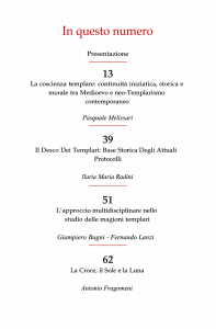 La dedizione che ognuno di loro ha messo per far sì che il primo numero della rivista venisse alla luce è davvero ammirevole, prova della passione e dell’interesse che tutti i componenti che fanno parte dell’ITAF hanno nei confronti del mondo templare e neo-templare. Così come è sorprendente il numero di contributi che sono pervenuti in redazione, a dimostrazione dell’incredibile interesse che la tematica possiede ancora oggi. Pur rimanendo, infatti, ancorato alla tradizione, ogni argomento selezionato, giunto da autorevoli cultori della materia, consente di rileggere in modo storico e, al contempo, anacronistico, tanti elementi templari che, dal passato, risorgono, dimostrando una sorprendente e inaspettata attualità.
